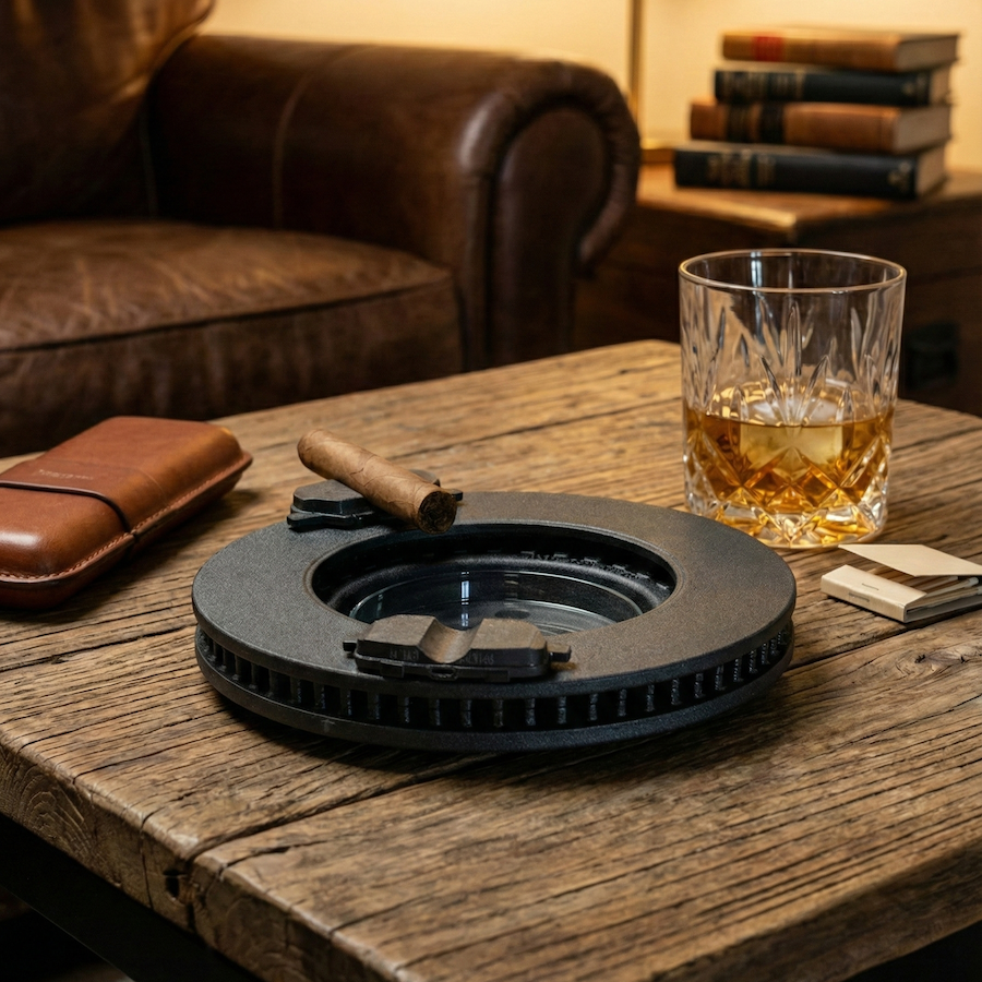 Bring the spirit of the garage into your lounge with the "Cigar Brake"—the ultimate intersection of horsepower and relaxation. We’ve taken the most critical component of automotive stopping power and repurposed it into a rugged, high-performance resting place for your favorite cigars.